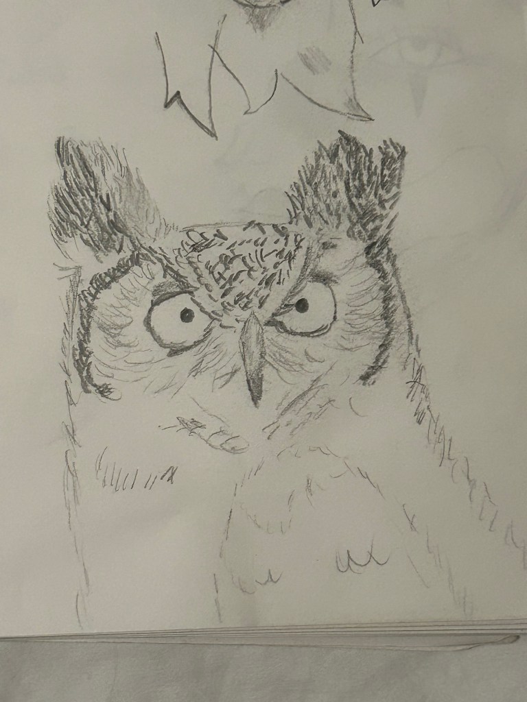 I don’t sketch much anymore but it’s certainly something I’d like to get better at, this is one of the ones I’m most proud of. One of my favorite animals, Owls, in this case a Great Horned Owl, an animal which represents wisdom, something I’ll need much of for this project.